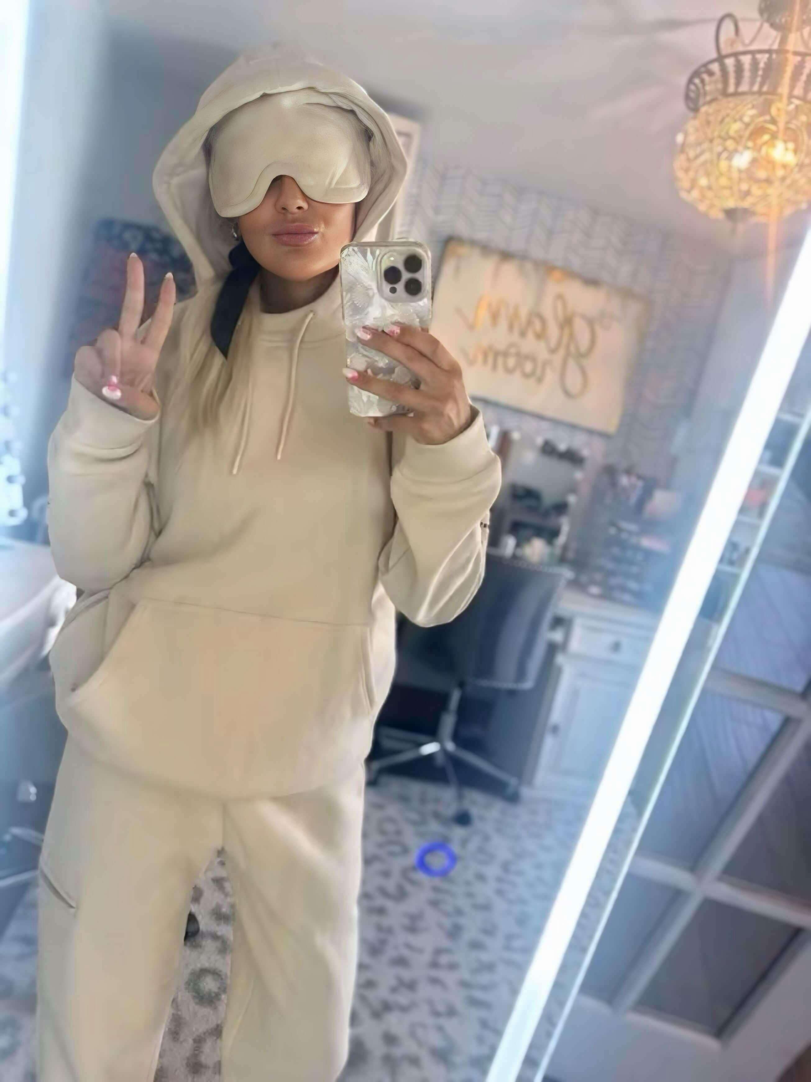 Der Snoozio Hoodie hat eine integrierte Augenmaske in der Kapuze. Ideal für Reisen, Powernaps oder einfach zum Entspannen. So vereint er Style und Funktion in einem Kleidungsstück.